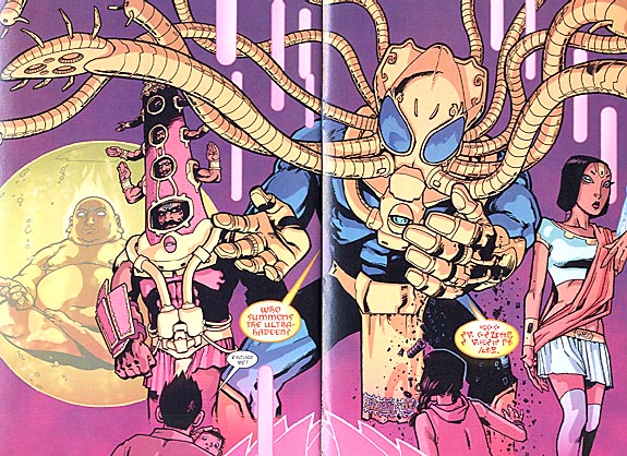 Bien sûr, la fin du monde vient secouer tout ce petit monde, et lorsqu’Ali se décide à avouer ses sentiments à sa promise, elle n’entendra rien à cause du chaos ambiant. Effet comique garanti. Entre les dialogues vifs de Morrison et les crayonnés réjouissants de Bond, Vimanarama est une petite histoire qu’on aura plaisir à parcourir encore et encore, même si sa courte durée ne lui permet pas d’être aussi mémorable que d’autres œuvres du scénariste. On regrettera d’ailleurs que le titre n’ait pas muté en série régulière, ou au moins qu’il n’y ait pas eu de suite, d’autant plus que la fin du récit s’y prête largement. Ce n’est pas tous les jours qu’on voit un dieu dévasté par un chagrin d’amour être blessé mortellement par une feuille d’arbre volant au vent. Le côté métaphysique de l’histoire donne lieu à des scènes visuellement très réussies, aux couleurs criardes mais bien mariées. Le récit prend une dimension plus sérieuse à cette occasion, et interroge tant sur la religion que sur le rapport qu’on peut avoir avec elle. Les dieux doivent-ils guider les hommes ou bien les hommes doivent-ils se saisir de ce qu’on a à leur offrir pour transcender leur potentiel ?